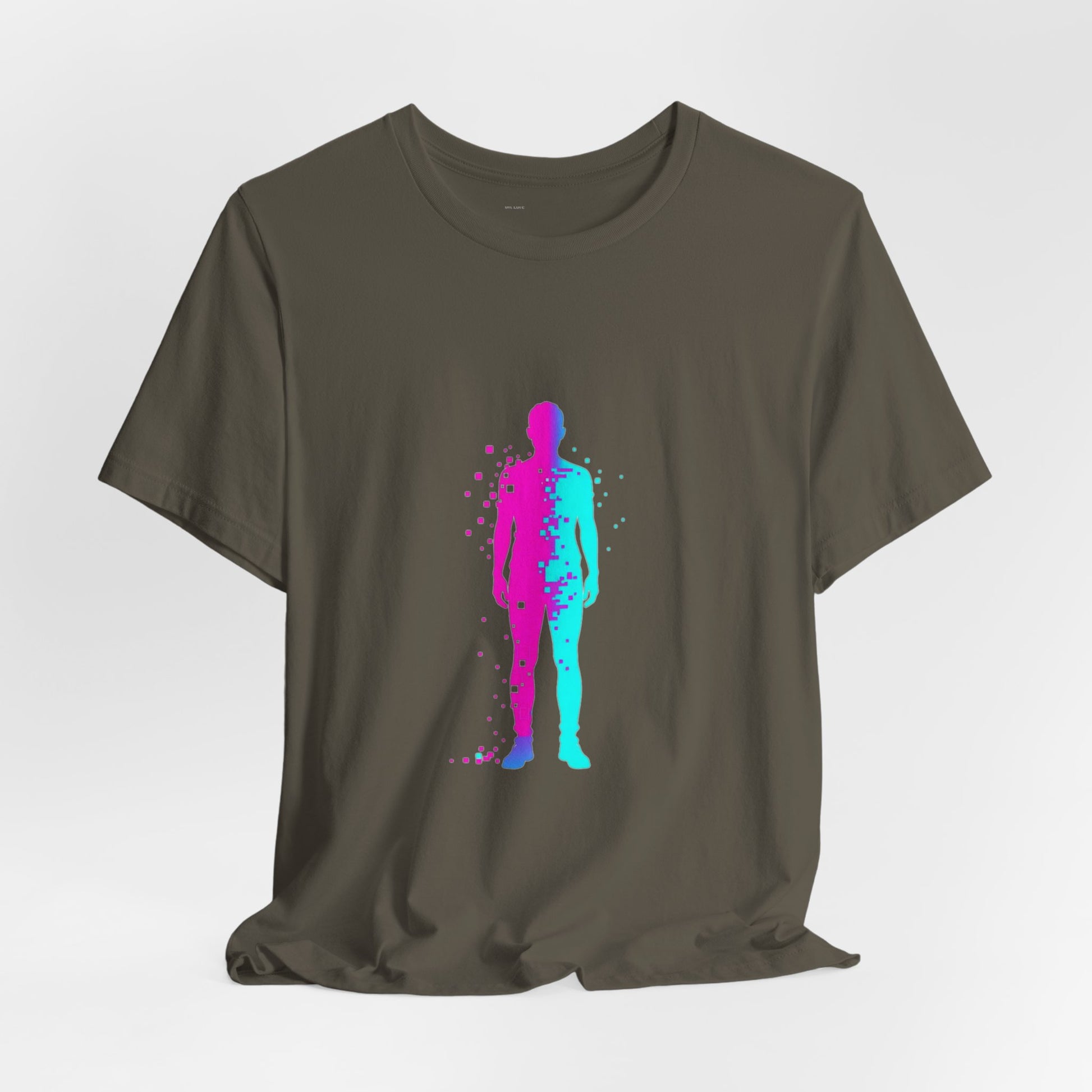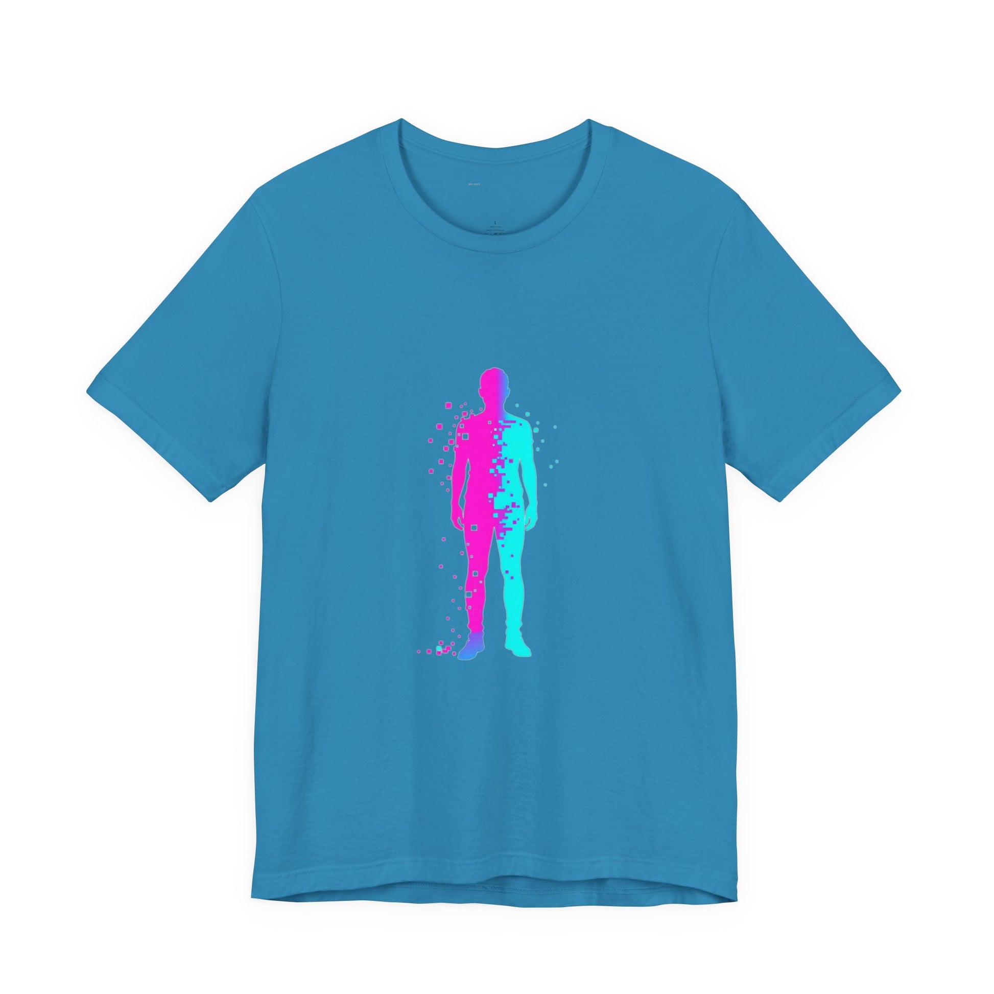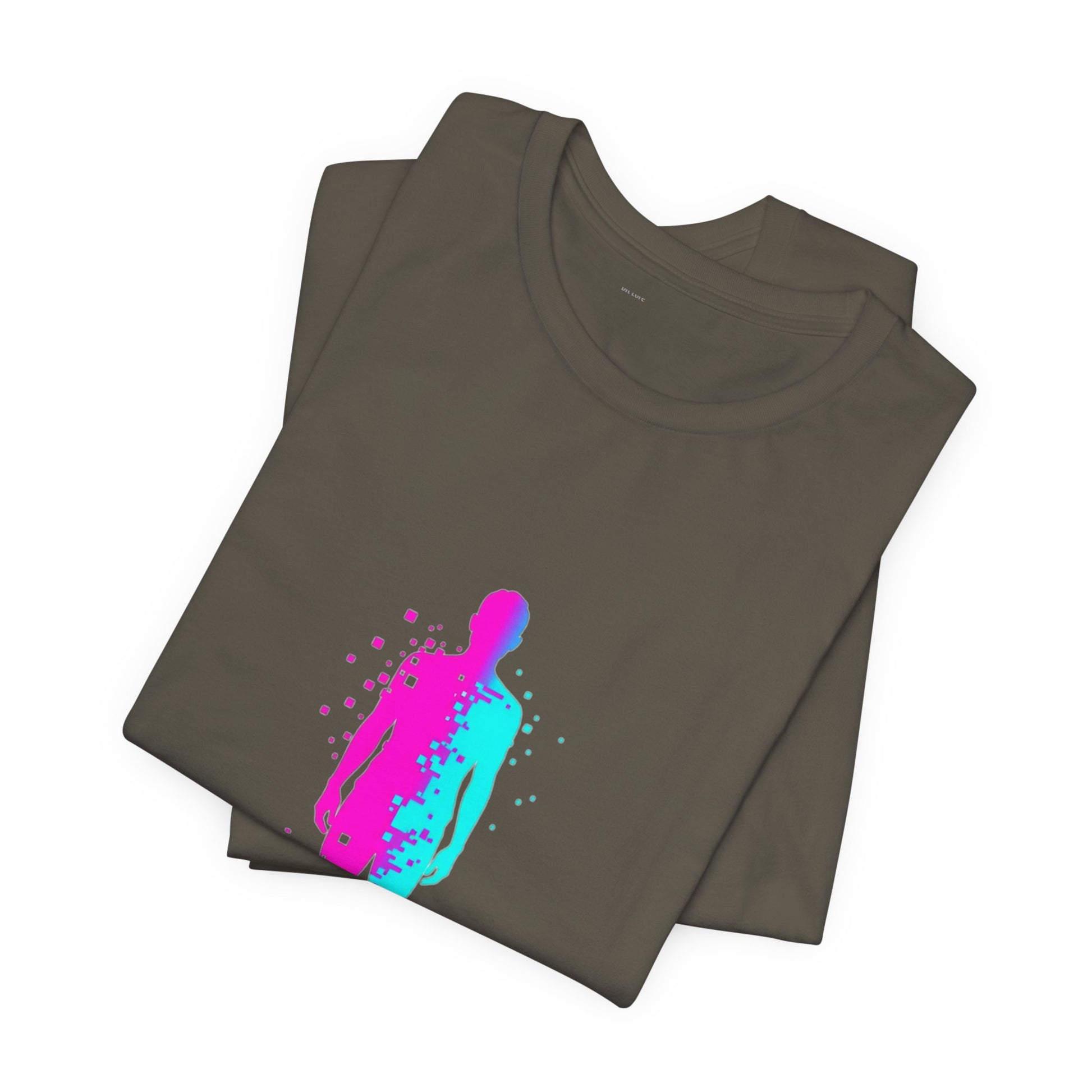 This glitched reality tee features a fragmented human silhouette dissolving into electric cyan and hot magenta pixels. Perfect for anyone who lives between the digital and physical worlds.