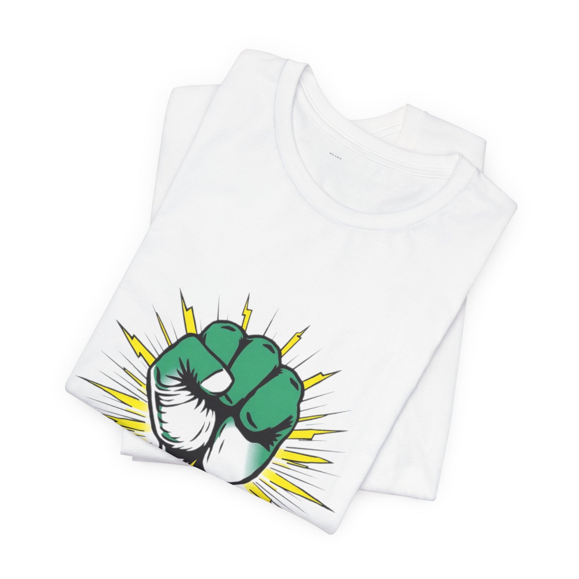 Picture this: a powerful clenched fist in deep forest green with electric yellow lightning bolts exploding outward. It's raw, it's real, it's unapologetically you.