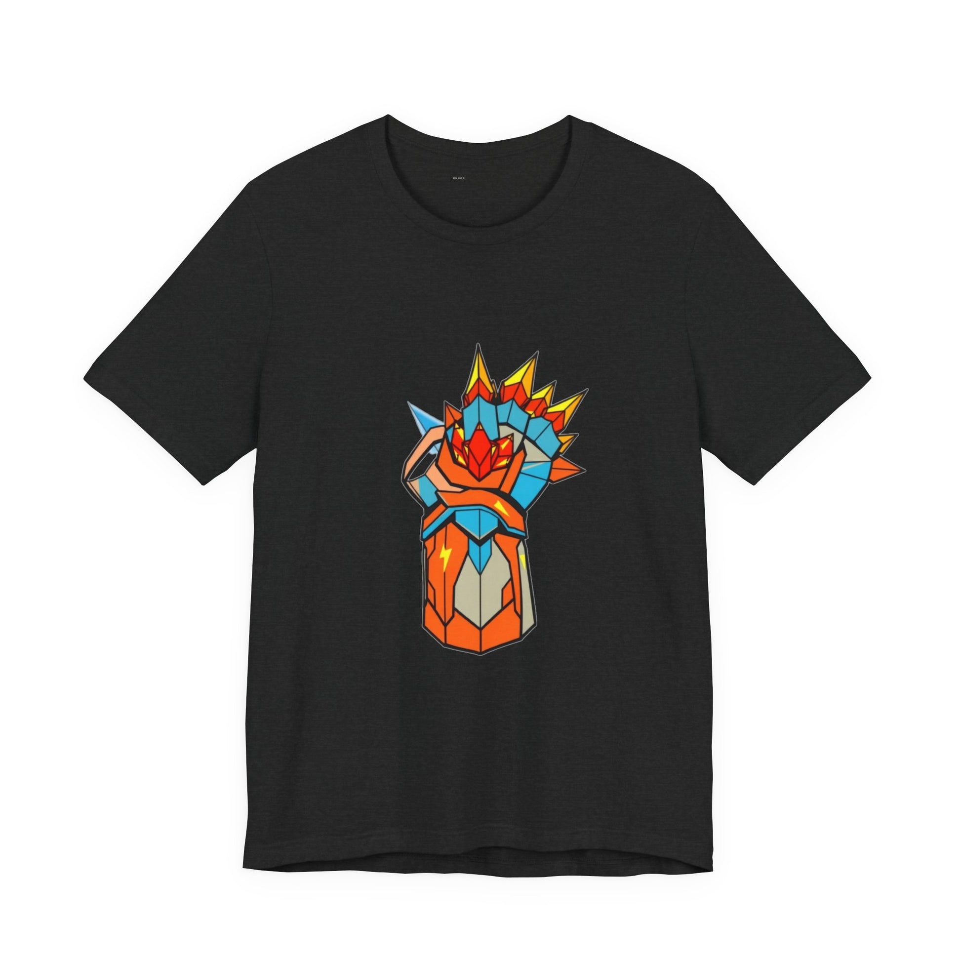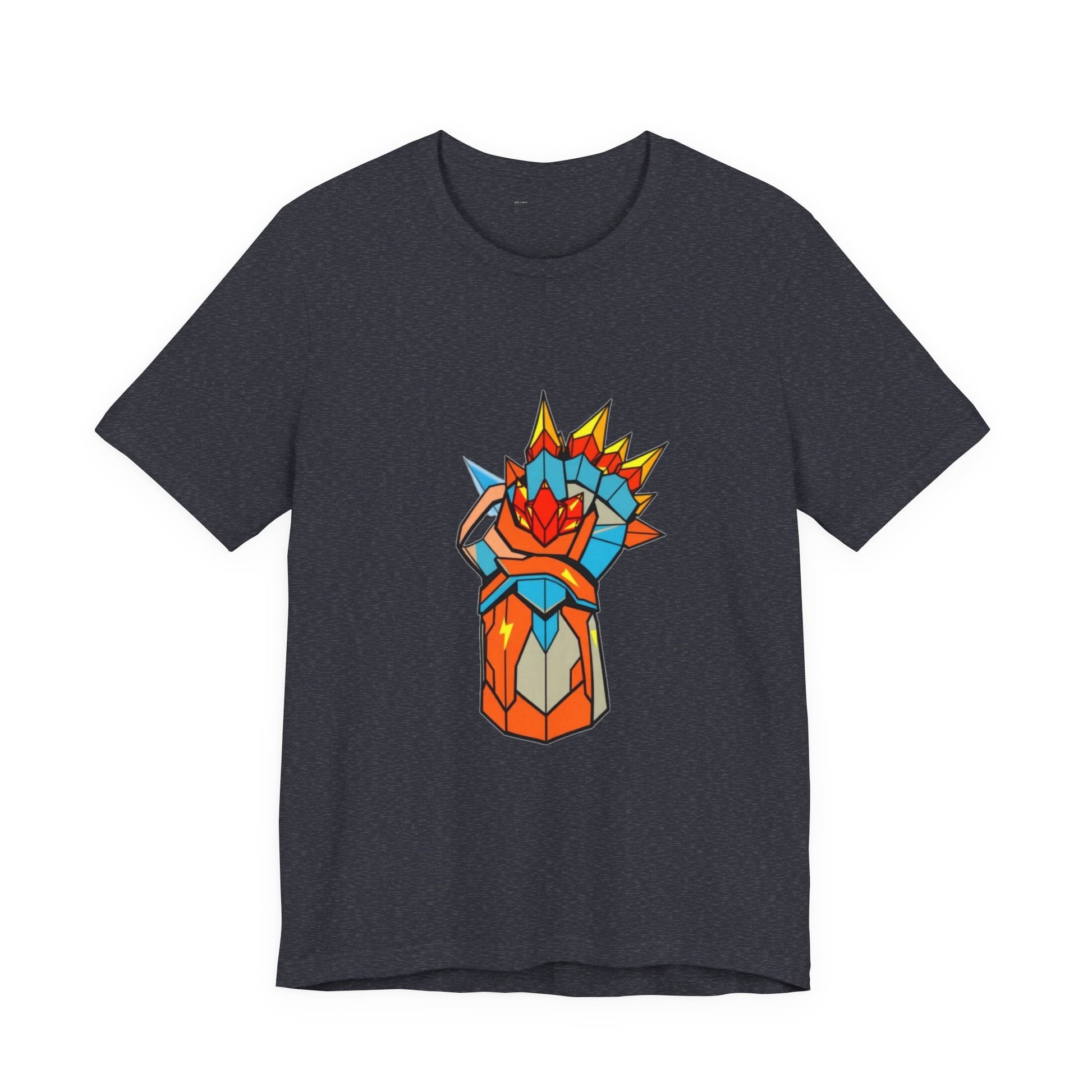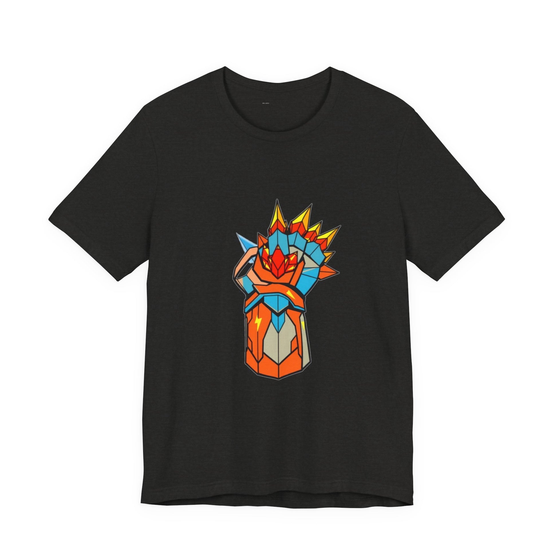 This isn't just another gaming tee. The Power Surge Gauntlet features angular armor plating with crystal energy spikes in electric cyan and molten orange – perfect for leveling up your streetwear game.